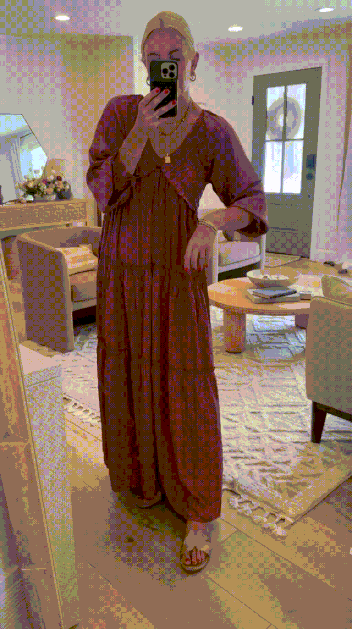 This flowy dress is floor length and looks nice and understated! It has stretchy details on the upper body with a loose layered ruffle hem that not only show your collarbone and shoulder, but also hide the fat in your abdomen, while not swallowing you in fabric.
