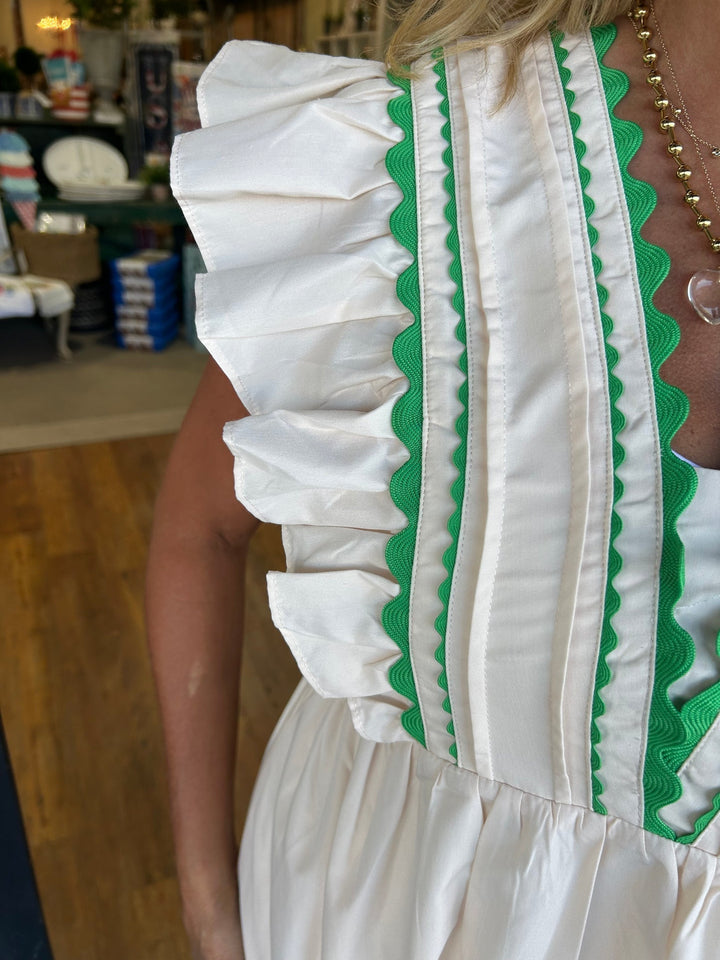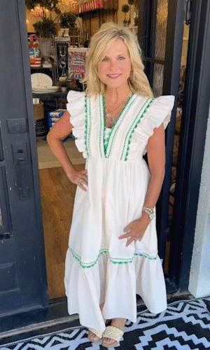Twirl and spin in our Ruffle Sleeve Maxi Dress! This dress features a great maxi length, v cut neckline, ruffle sleeves, and the most adorable Ric Rac trim!  The hidden zipper ensures a perfect fit while the lightweight fabric keeps you cool and comfortable. Perfect for any occasion, this dress will have you looking and feeling fabulous.