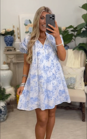 This flattering frock features a dainty floral toile print in shades of blue and white, complemented by delicate puff sleeves and a ruffled v-neckline that buttons down the front. The white seam details add a touch of sophistication, while the fully lined construction and convenient pockets offer both style and practicality.